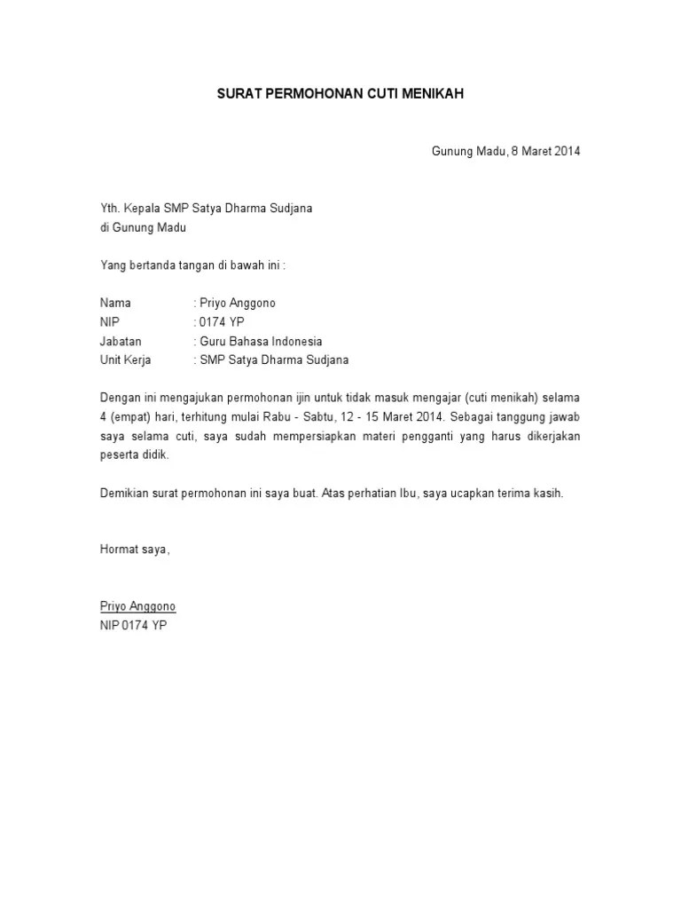Demikian surat permohonan ini dibuat, atas perhatian dan terkabulnya permohonan ini, . Cara membuat surat pemberitahuan cuti yang benar dalam bahasa inggris. Maka dari itu di bawah ini adalah contoh surat pengajuan cuti kerja dalam bahasa inggris yang bisa anda pergunakan. Contoh email pemberitahuan cuti dalam bahasa inggris via. Cuti kuliah surat permohonan cuti menikah contoh surat permohonan. Apa izin pengambilan cuti nikah ini termasuk ke dalam cuti tahunan atau berbeda? 16 contoh surat cuti menikah guru pns dan karyawan contoh surat contoh surat permohonan cuti menikah belajar office izin cuti contoh surat . Contoh surat permohonan cuti untuk nikah id lif co id. 16 contoh surat cuti menikah guru pns dan karyawan contoh surat contoh surat cuti. Selain itu gambar ini juga memiliki berbagai ukuran. Sehingga akan lebih memudahkan anda ketika membuat surat izin untuk cuti di kantor. Bersama surat ini saya mengajukan izin cuti menikah pada tanggal 26 sampai dengan 30 september 2018. Demikian surat cuti ini saya ajukan.